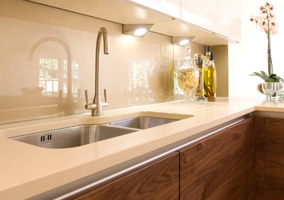 На стекле всегда видны отпечатки, капли и грязь, поэтому придется фартук часто протирать. Плюс в том, что ухаживать за ним очень просто — необходима только салфетка из микрофибры. Стекло чаще всего цельное, то есть не имеет стыков — и нет даже шанса на то, что там кто-нибудь заведется. Закаленное стекло устойчиво и к повреждениям, и к перепадам температуры, поэтому его срок службы практически не ограничен.