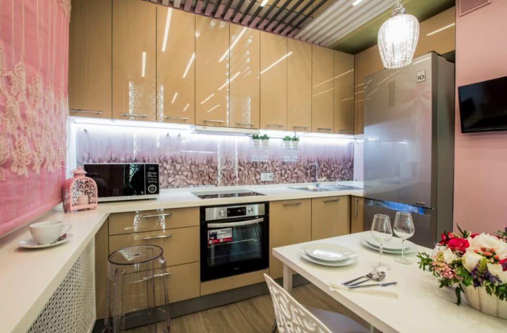 Когда комната довольно маленькая, принято использовать светлые оттенки, даже белый цвет. Если вы тоже его приверженец, то над столешницей на стене лучше закрепить фартук, который будет сочетать сразу несколько оттенков. Это может быть молочный и светло-голубой.