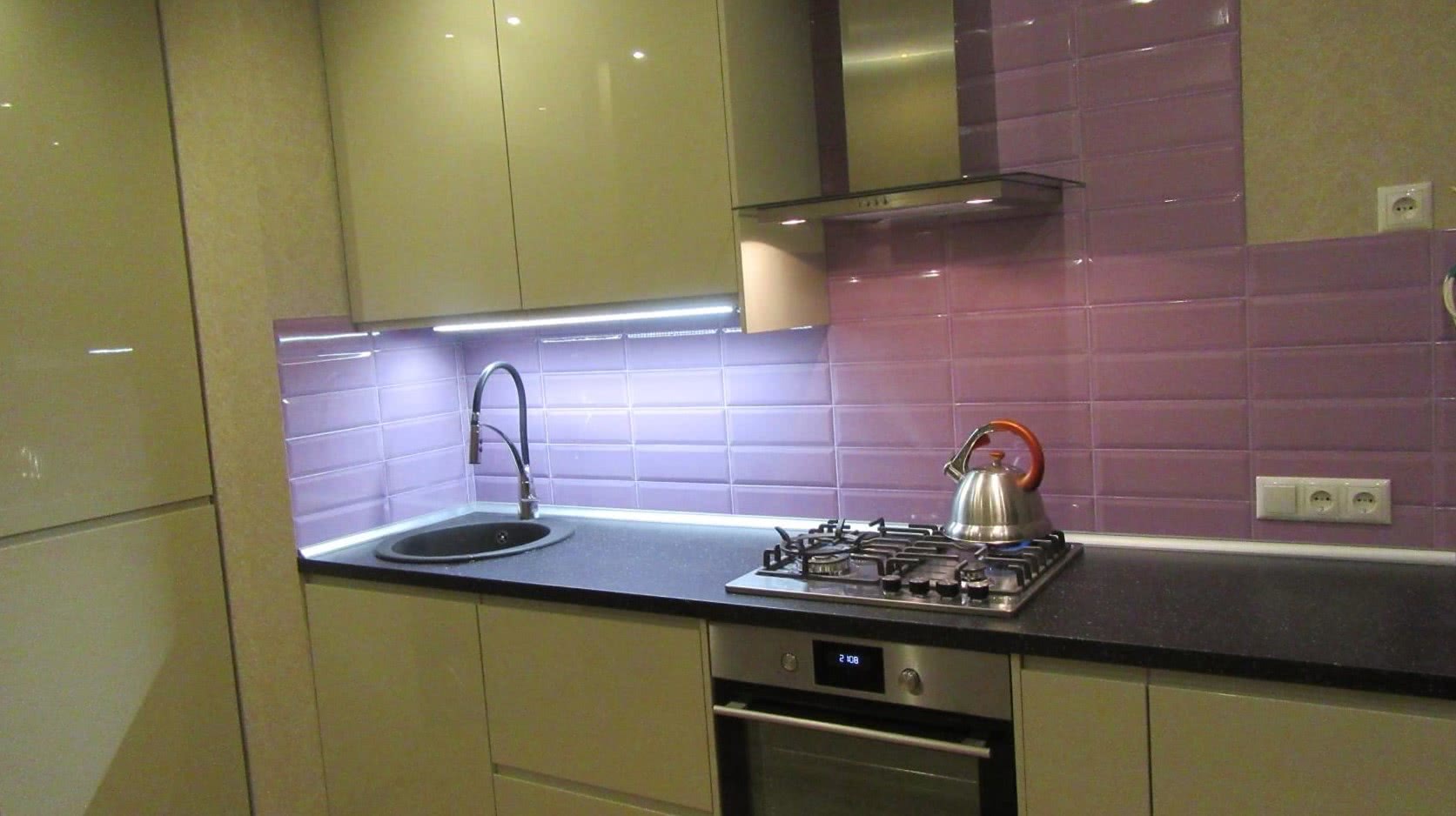 Интереснее всего смотрится подсветка в сочетании со стеклянными панелями. В зависимости от того, используется тёплый свет или холодный, кухонный фартук будет смотреться по-разному. Цветная подсветка поможет внести оригинальность даже в самую скромную отделку.