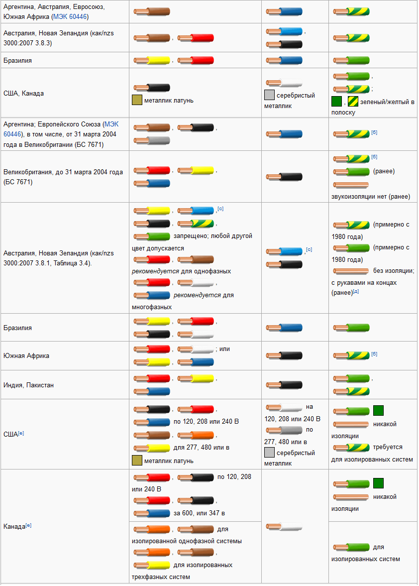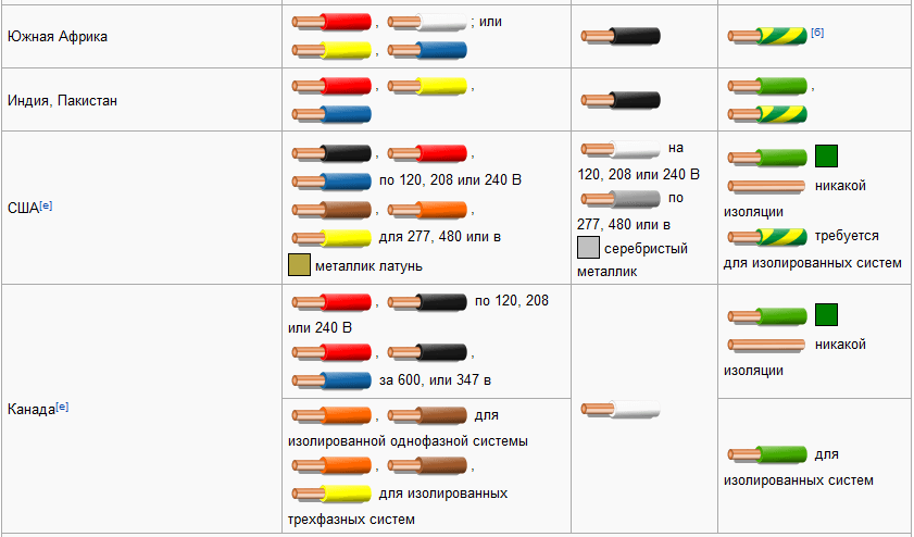 Другие цвета проводов применяются для фаз и могут быть различными, кроме цветов означающих другие провода.