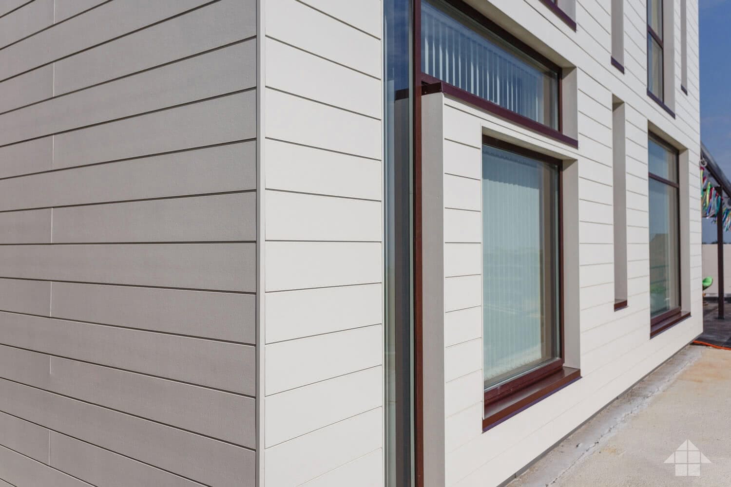 Фиброцементный сайдинг или плиты (фибросайдинг) — композитный материал на основе цемента, который используется для наружной отделки фасада. Монтируется по принципу вентилируемого фасада — на обрешетку. Некоторые системы допускают монтаж на деревянный каркас, другие (японские) рекомендуют только свой — из металла.