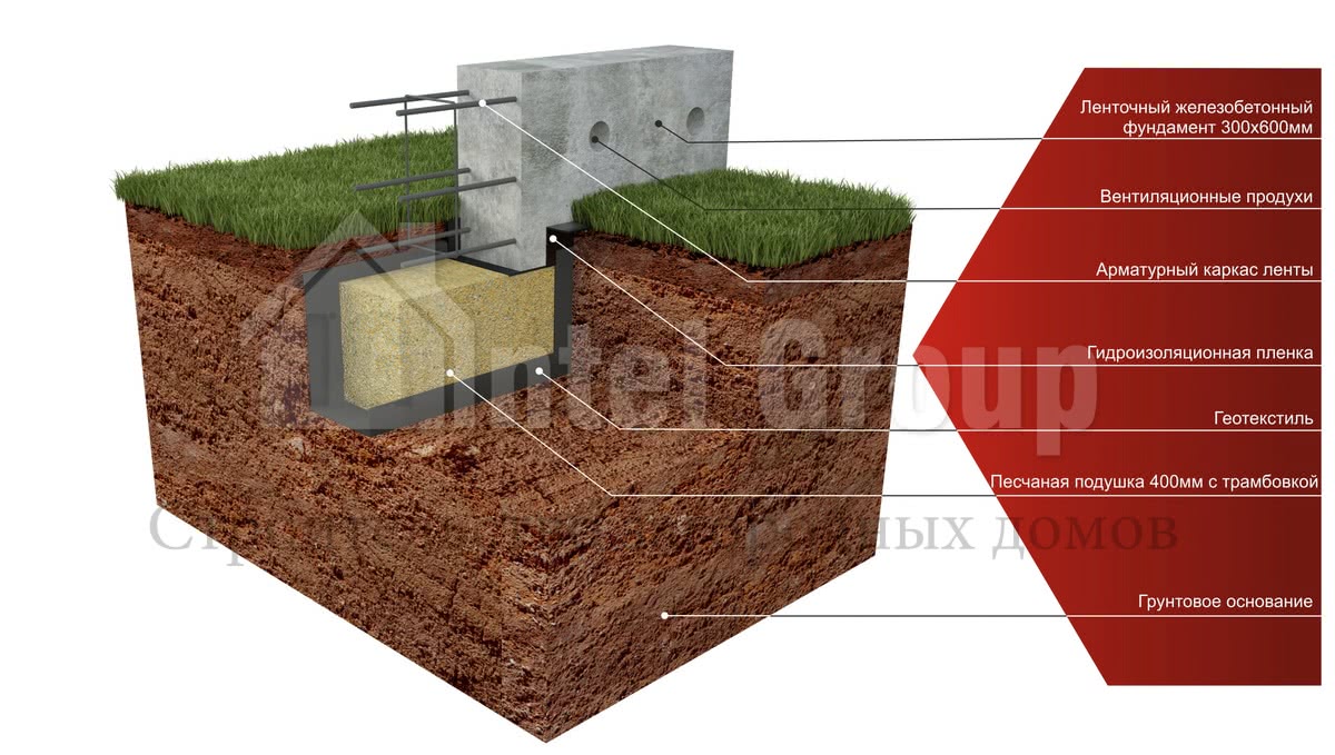 неустойчивые грунты. В этом случае закладывается ленточный фундамент, но не