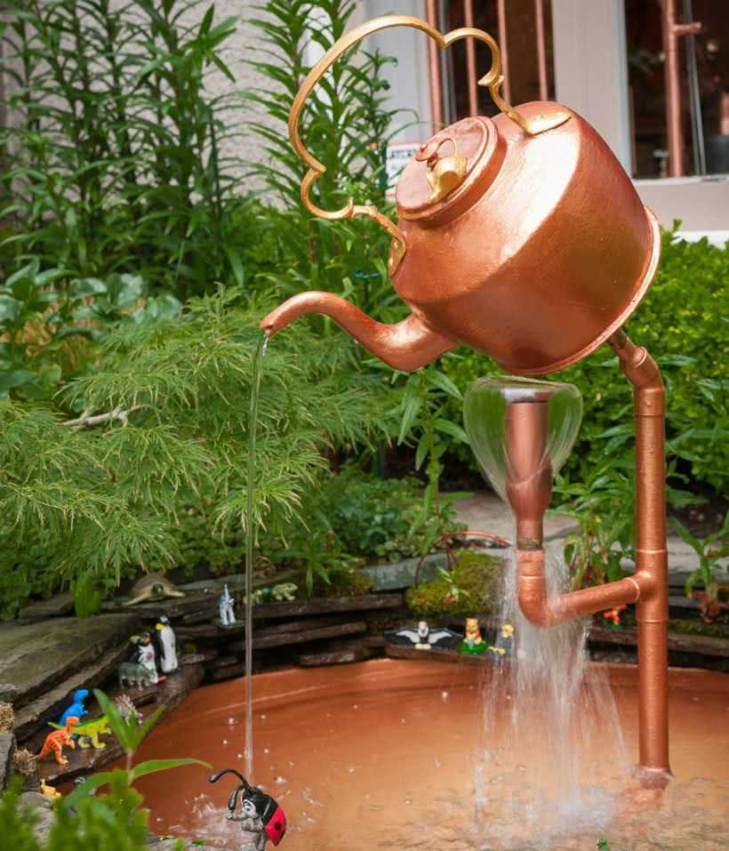 Более аппетитным будет вот такой натюрморт. В дело пойдут старинные самовары, чайники и чашечки, а трубка насоса спрячется в ножке чайного столика. Изобилие, изливающееся на землю, будет символом бесконечной гостеприимности хозяина дачи.