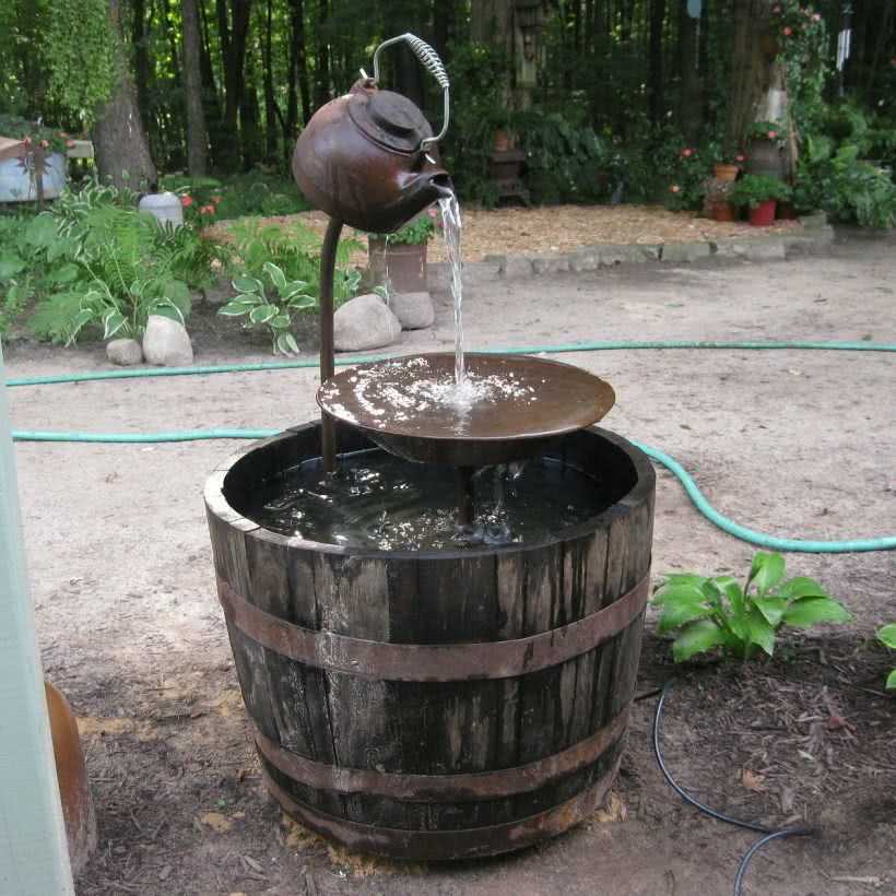 Если же водоема нет, то придется сначала соорудить чашу для гидротехнической установки, а затем уже и сам фонтан. Совсем не обязательно делать масштабный водоем, достаточно выполнить миниатюрную чашу, причем используя какие-либо старые предметы — тазы, бочки и т. п. В этом случае форма фонтана и его размеры будут напрямую зависеть от выбранной емкости, останется только ее декорировать.