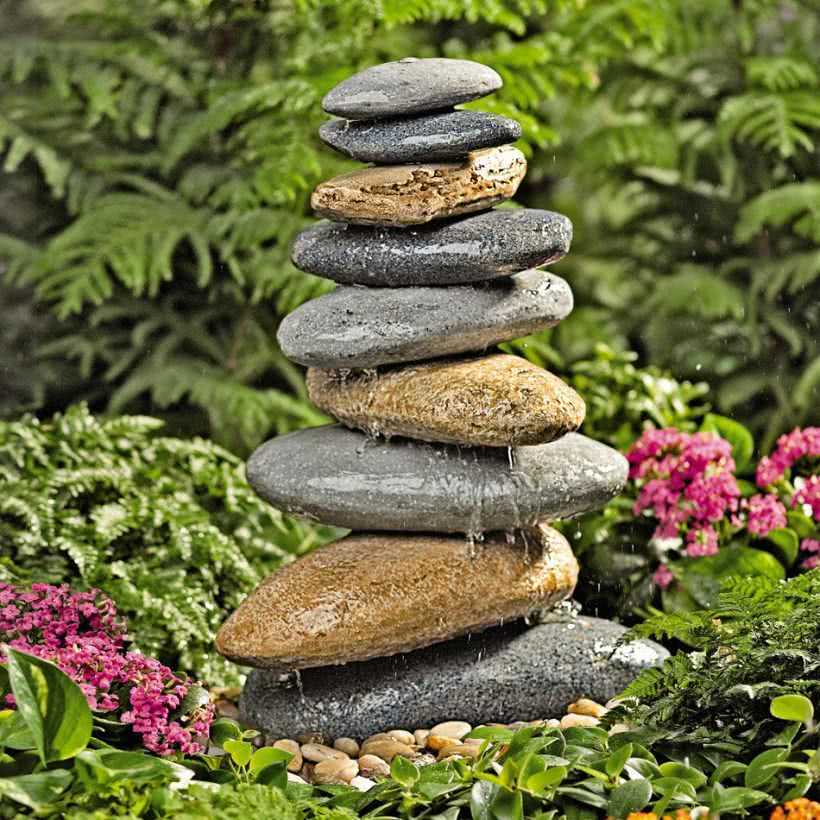 Камни и щебень. Они зачастую маскируют основание фонтана и расположенный под ним резервуар с водой и насосом. Допустимы варианты с раскладкой крупных камней в хаотичном порядке на мелкой гальке. Рекомендация от дизайнеров в этом случае — использование не больше двух разновидностей камня, что позволит избежать нагромождения расцветок и форм.