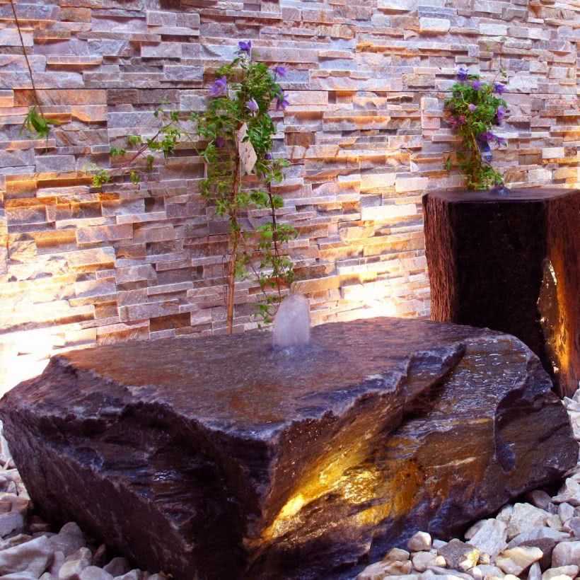 Отличная иллюстрация того, что заниматься земляными работами для обустройства фонтана необязательно. Геометрически выверенная каменная плита становится преградой на пути бьющего якобы из недр источника и, не выдерживая его мощи, пропускает вверх.