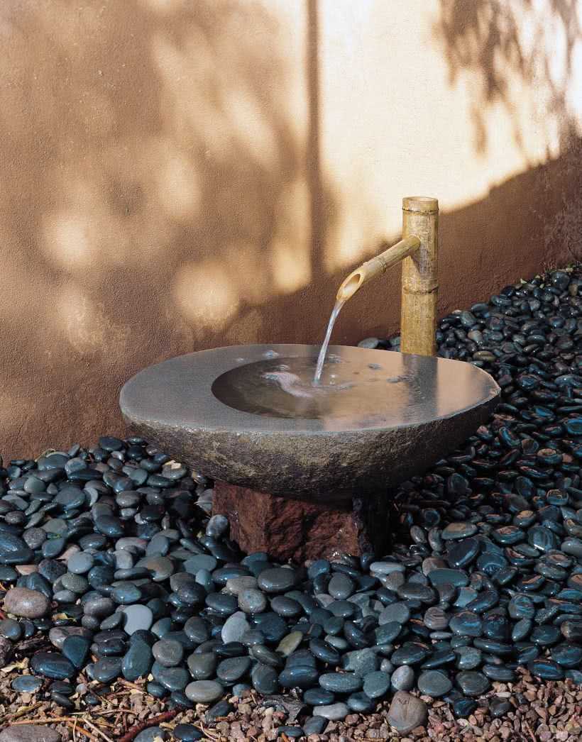 Сам фонтан можно купить в готовом виде или смастерить самостоятельно из подручных средств, используя различный отделочный материал — стеклянные изделия, керамические детали, природный камень, речную гальку, бамбуковые стебли, декоративную плитку и т. д.