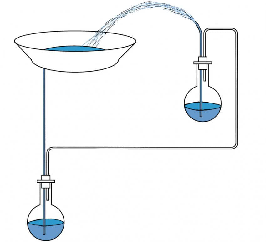 Вода из основной чаши опускается и создает давление в нижнем сосуде, где вытесняет воздух, который, в свою очередь, создает избыточное давление в среднем сосуде и вода стремится наверх через трубку, образуя фонтан.