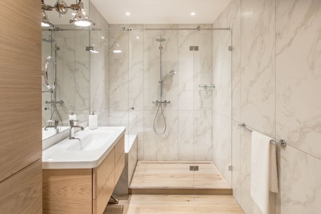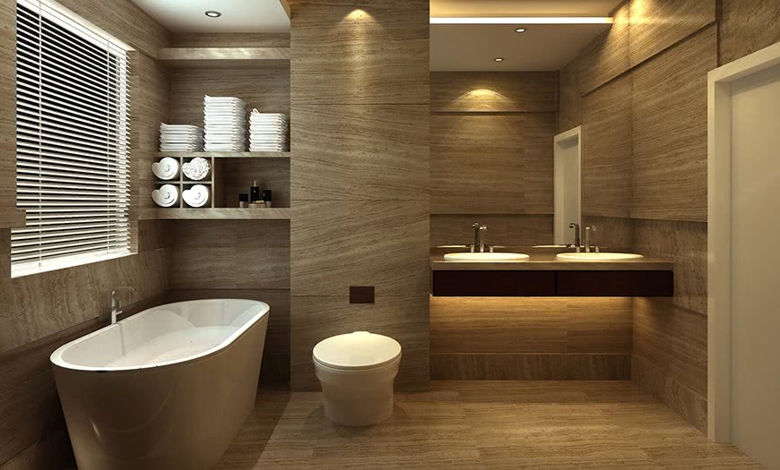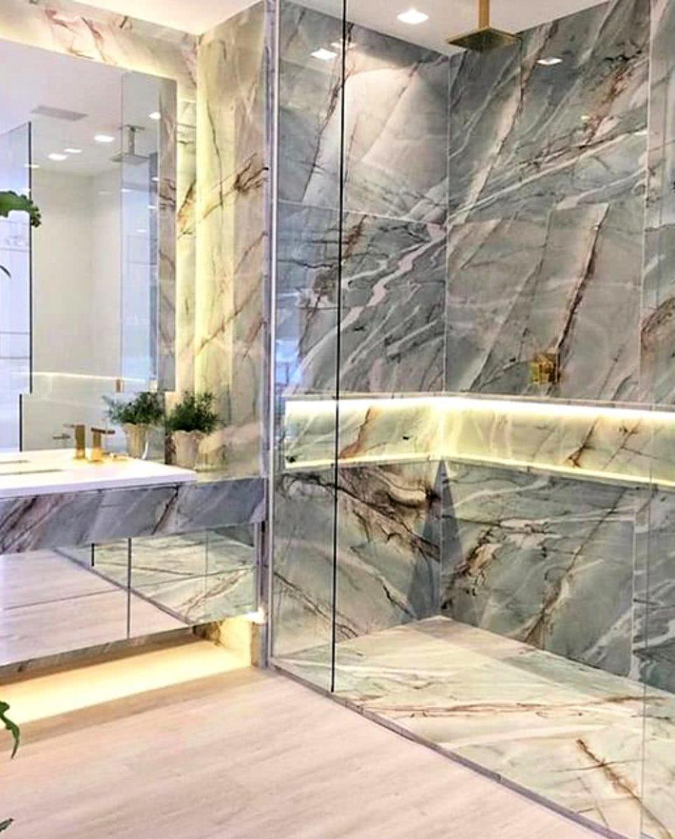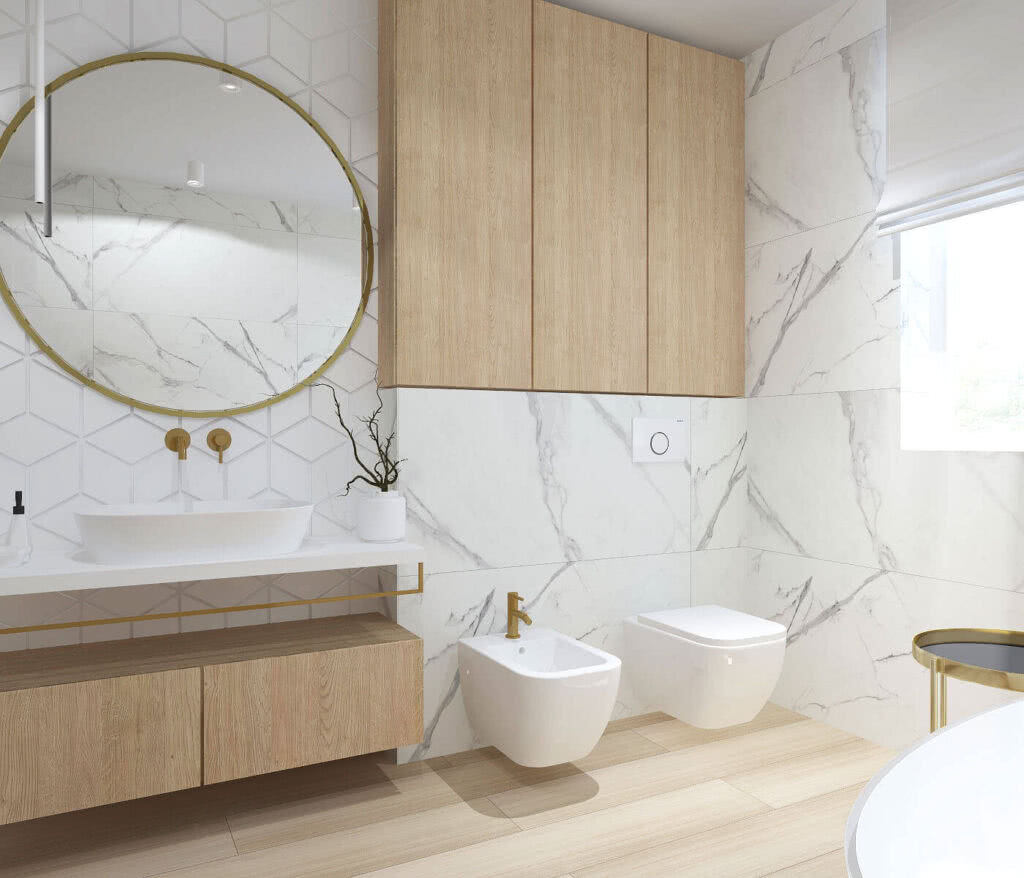 По практическим соображениям в ванной комнате стоит использовать керамическую плитку, идеально отражающую оба этих эффекта. Светлый мрамор и плитка под дерево для ванной комнаты могут эффектно сочетать золотистый декор, который хорошо сочетается как с деревом теплого оттенка, так и с светлым мрамором калакатта. Такое сочетание хоть и внешне очень далеки друг от друга, но отлично впишется в современные интерьеры.