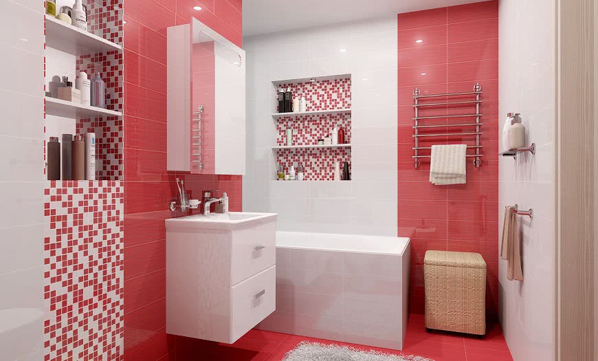 В ванной принято использовать нейтральные, спокойные оттенки. Но можно гармонично внедрить и яркие сочетания цветов и фактур.