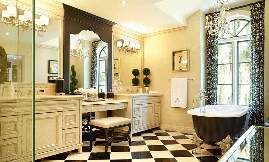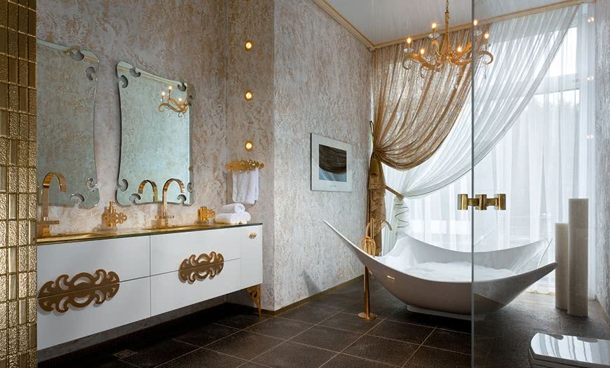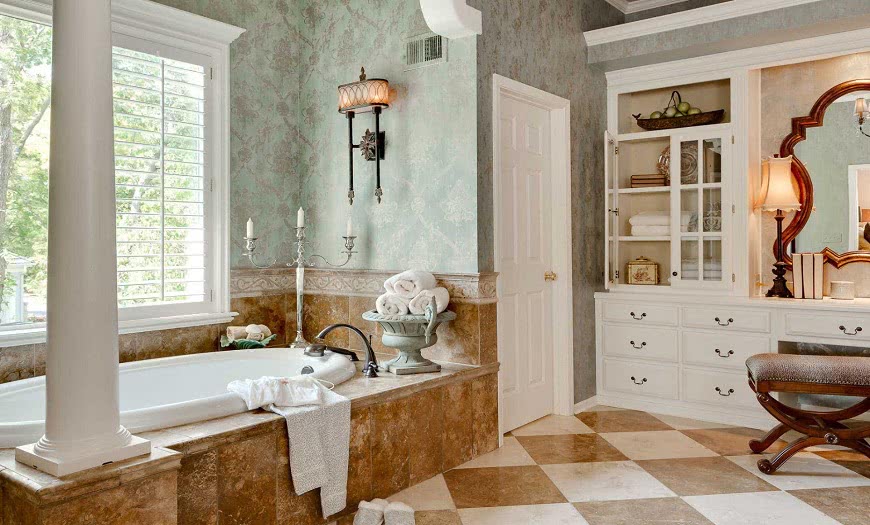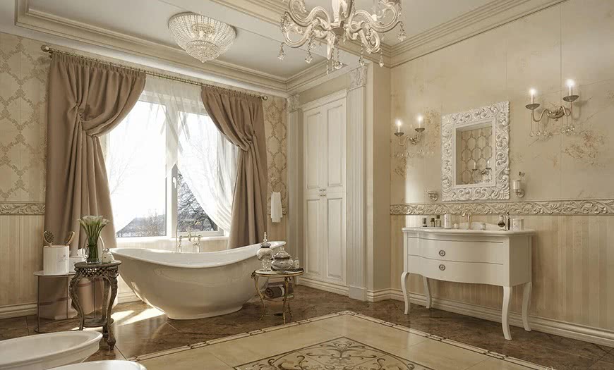 Поклонники этого стиля в интерьере предпочитают натуральные и элитные отделочные материалы. Мебель покупают из дорогой древесины, а для освещения применяют хрустальные люстры. Сантехнические изделия, такие как раковина и унитаз, изготавливаются из натурального камня или фарфора с росписью.