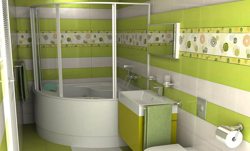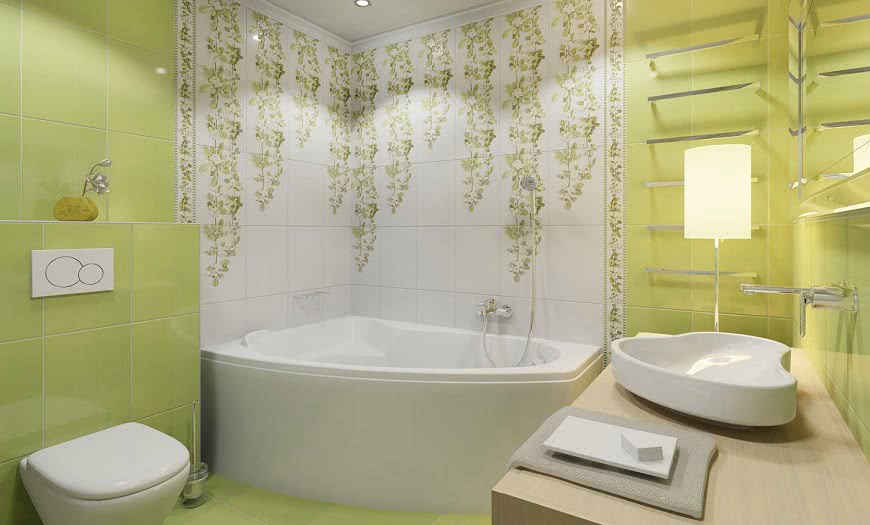 - Эстетично и современно смотрится решение с угловой ванной хотя бы потому, что в углу, где она расположена, можно разместить цветное панно из керамической плитки, которое дополнит дизайн.