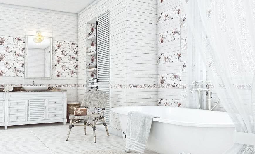 Чтобы получить этот эффект, можно приобрести ретромебель, которая неплохо комбинируется с современными аксессуарами. В помещении можно установить белые шкафчики, светлую ванну и обои с нежной фактурой.