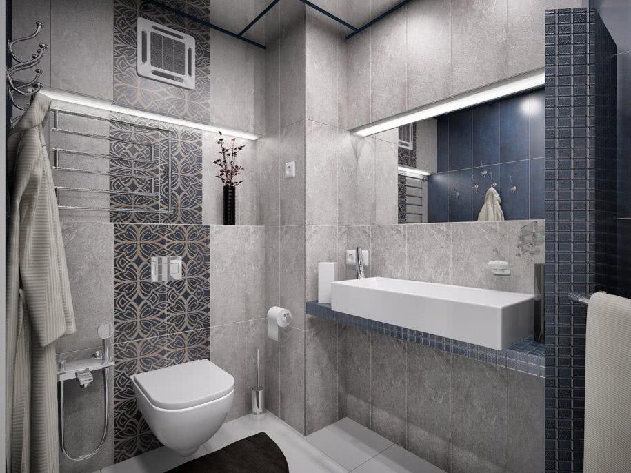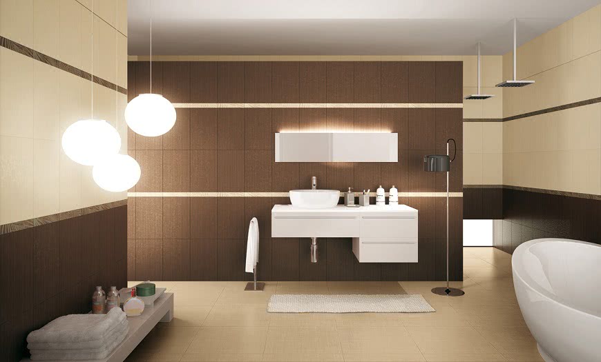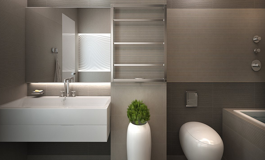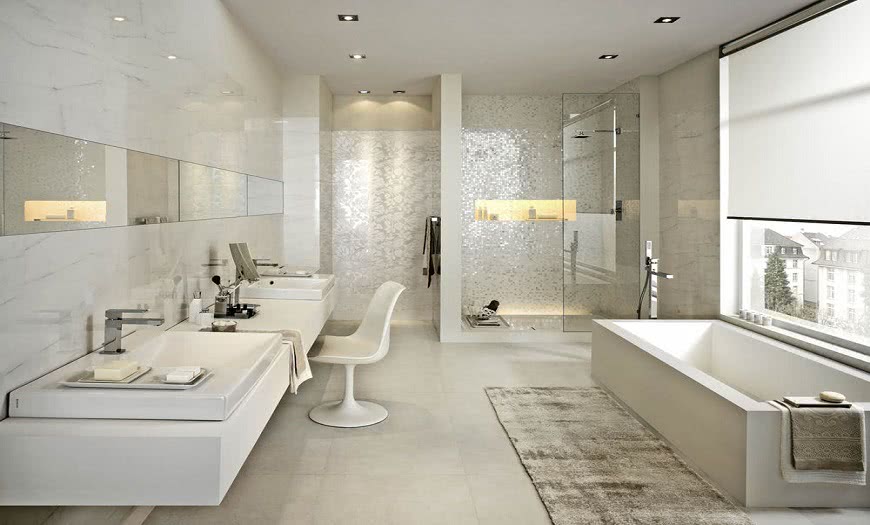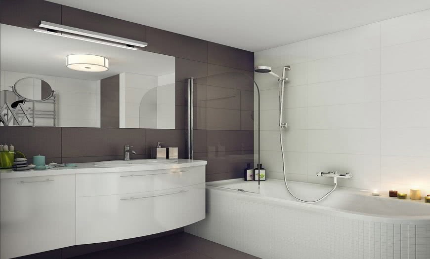 Также популярна идеально гладкая плитка, например, большая прямоугольная- белая или бежевого или серого оттенка. Чтобы нарушить монотонность готового интерьера, используются элементы контрастного цвета, например, светлая настенная плитка, более темная плитка для ванны и корпуса умывальника или внутренняя часть душевой кабины.