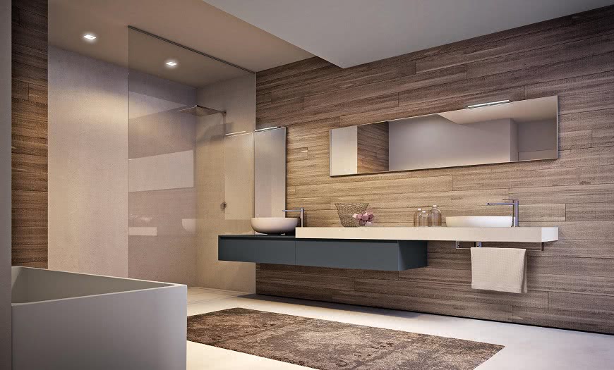 Большая современная ванная комната с двумя раковинами, впечатляющей ванной и минималистичной душевой кабиной обычно возможна в больших односемейных домах площадью более 100 м2. Примером может служить вариант проекта дома (фото ниже) с полезной площадью 170 м2, где ванная комната имеет целых 11 м2 и действительно позволяет установить очень богатое и удобное оборудование.