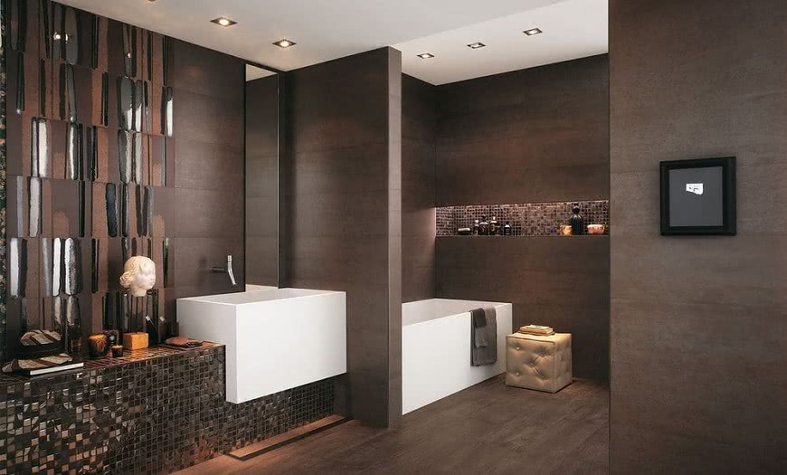 Современная ванная комната из кафеля тоже модная, а потому в основном крупноформатная. Они могут быть глянцевыми или матовыми, но почти всегда гладкими. Узоры, орнаменты и различные аппликации на плитке не приветствуются в современном стиле.