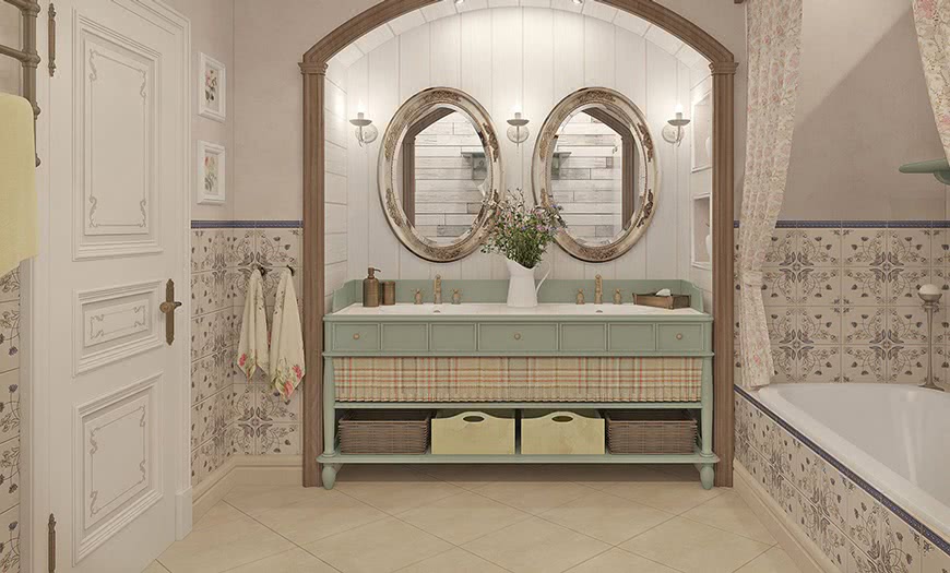 По оформлению этот стиль напоминает кантри. Он ассоциируется с французскими помещениями середины XIX в. В комнатах устанавливают небольшое окно с занавесками с цветочным орнаментом, используют вазы с живыми цветами. При этом встретить керамическую плитку или пластиковые панели в таком интерьере — редкость.