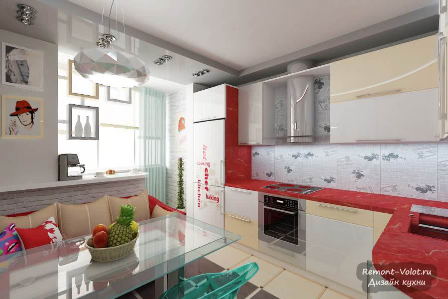 Пример контрастного цветового решения с превращением балкона в уютный закуток на кухне. Обилие белого делает помещение светлым, а красный и газетные принцы расставляют акценты на зонах.
