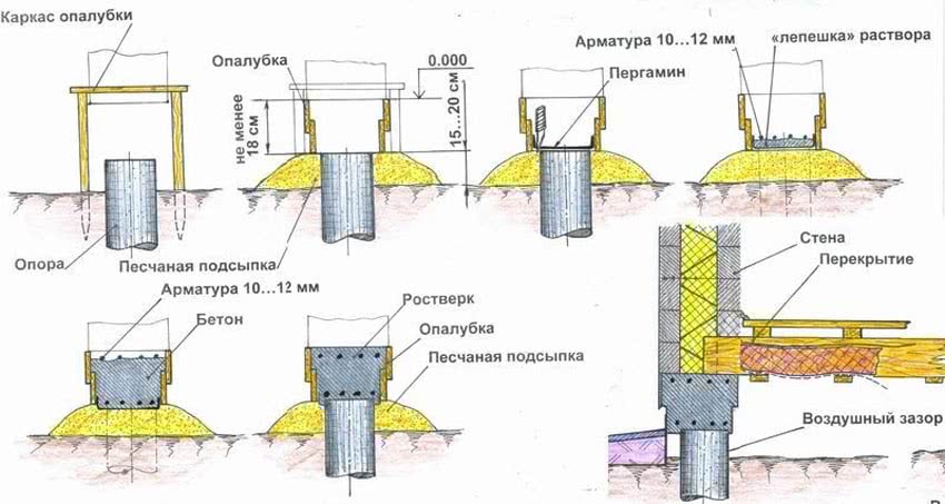Прежде чем пользоваться подобным методом, очень важно обеспечить дополнительную гидроизоляцию сваям. Очень хорошим преимуществом в данном методе является то, что при временной опалубке реально сделать промежуток из песка между фундамент на буронабивных сваях и самой землей