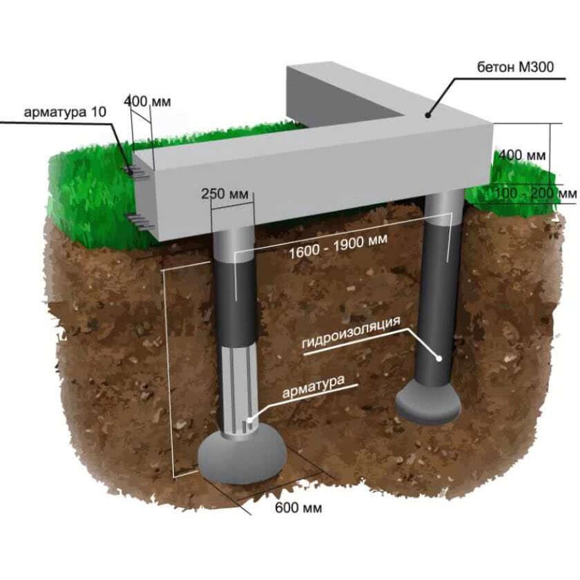 Для заливки используют бетон прочностью М250–300. Вначале заливают пяту, затем помещают в скважину опалубку из свернутого в трубу листового рубероида, который должен выступать над поверхностью на высоту, равную значению надземной части опорных элементов.