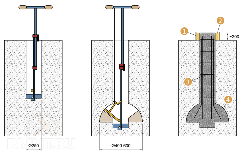 Как подсчитано, в среднем, в день по три расширения можно сделать легко, но заливка сама по себе отнимает очень много времени. Так, например, при диаметре скважин до 30 см, расширение будет до 60 см. В этом случае, на один столб пойдет около 30 кг цемента
