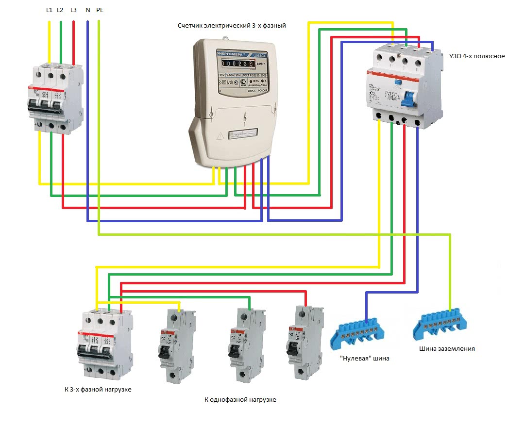 На рисунке представлена современная сеть с отдельным подключением заземления и рабочего нуля. Предусмотрена возможность подсоединения трех,- и однофазных нагрузок.