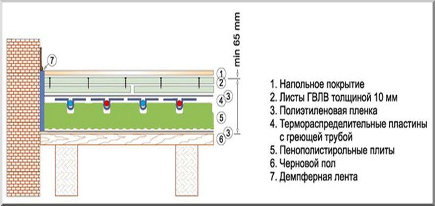Водяной теплый пол с настилом ГВЛВ обустроить сложнее, но он считается более надежным вариантом, к тому же конструкция быстрее окупается
