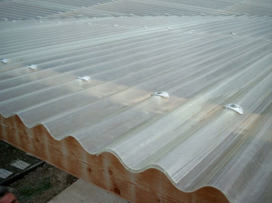 Пластиковый шифер отлично справляется с негативными природными воздействиями. Из материала часто возводят ограждения для бассейнов, оранжерей, навесов. Пластиковый шифер сохраняет свои свойства при действии агрессивных сред. Это покрытие пропускает солнечные лучи, достаточно морозоустойчиво. Шифер из пластика удобен в монтаже, так как он легкий, не требует тяжелой обрешетки.