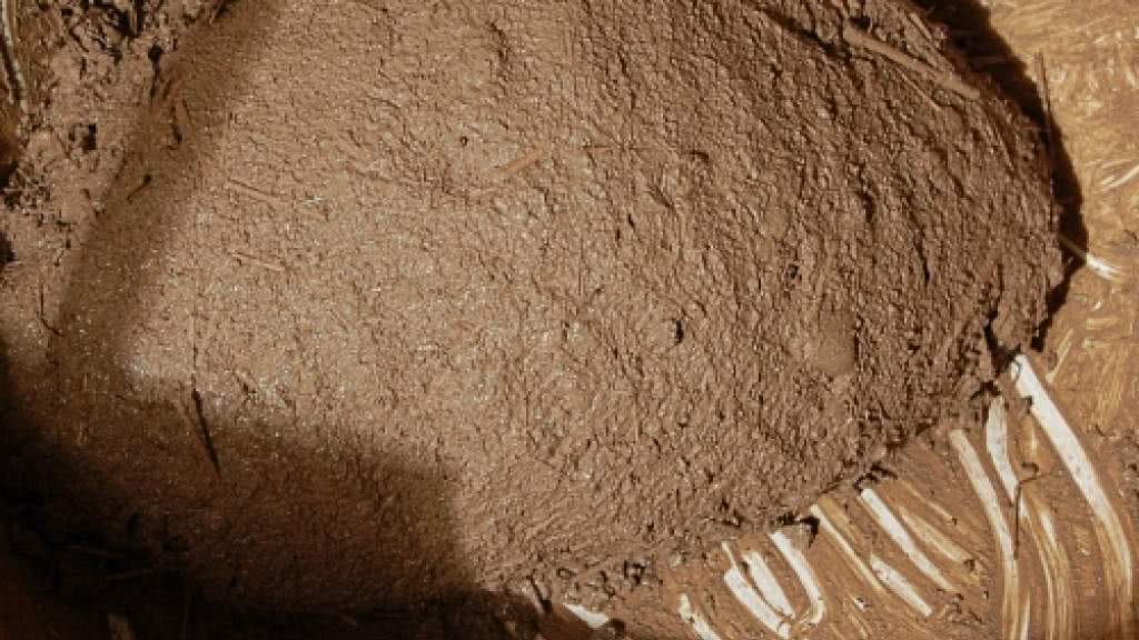 - Когда раствор будет готов, добавляйте в него песок и солому, а также другие компоненты и тщательно перемешивайте ногами. Не высыпайте все материалы сразу, а добавляйте небольшими порциями, постепенно втаптывая их в основной раствор.
