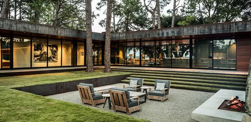 Архитектурный ансамбль может быть любым. Визитной карточкой современного дома считается плоская кровля (что не всегда оправдано в регионах со сложными погодными условиями и снежными зимами). Нередко на такой крыше организовывают зону отдыха, устанавливают солнечные батареи. Другой узнаваемый прием – использование промышленных акцентов, что особо проявляется в домах в стиле хай-тек