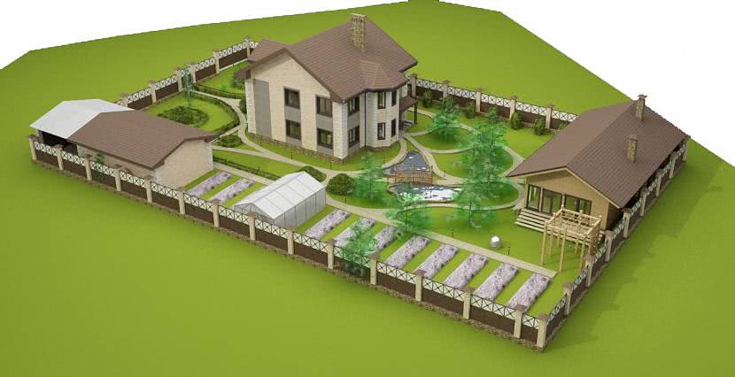 Начинать стоит с определения размеров дома и его возможного расположения на участке. Сделать это можно, только имея на руках его подробный план с указанием всех размеров, сторон света, особенностей рельефа, дорог, коммуникаций и уже имеющихся на нем объектов, не подлежащих сносу, если таковые есть. Желательно также иметь общий план с изображением соседних участков и природных объектов, чтобы из окон спроектированного дома открывался красивый вид, а не соседский сарай.