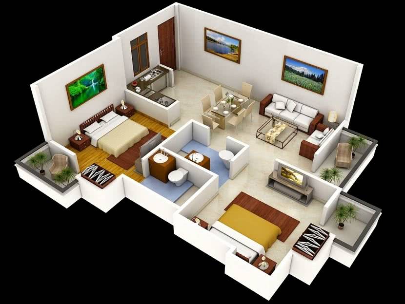 Планировка дома: две спальни, два санузла, кухня, гостиная и столовая совмещеныИсточник aranyawiwake.com