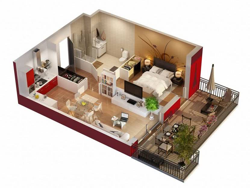Планировка дома с открытой террасой и одной спальнейИсточник cutithai.com