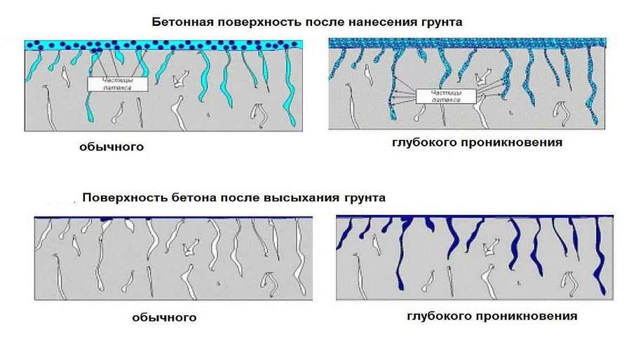 Очень мелкие частицы полимера растворяются, и с жидкостью проникают по капиллярам вглубь грунтуемой поверхности. После высыхания полимерные частицы остаются в капиллярах, создавая там дополнительную кристаллическую решетку и уменьшая пористость материала (и его впитывающую способность заодно), создавая дополнительные связи между частицами материала. Как результат, после обработки поверхность перестает «пылить».