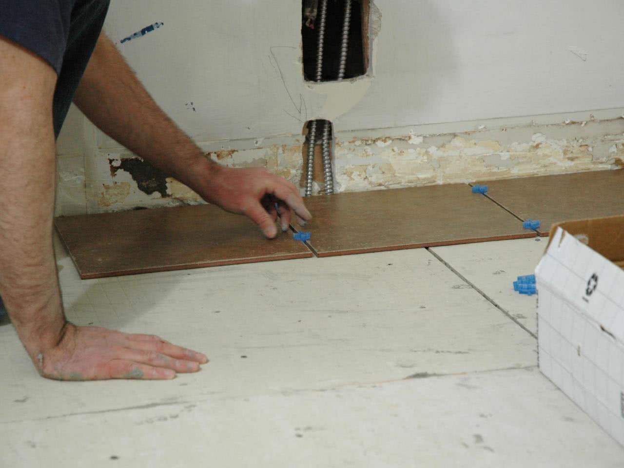 Отзывы показывают, что материалом из гипсоволокна отлично заменяется старый деревянный пол, а сверху него можно уложить керамическую плитку. Чтобы плитка легла наилучшим образом, основу необходимо подготовить, для чего и используются ГВЛ. Если пол не имеет особенных недостатков, листы гипсоволокна крепятся к полам с разбежкой в пол-листа – в первом ряду кладется целый лист, во втором – половина и т.д. После таких подготовительных мероприятий плитку можно монтировать обычным клеем.