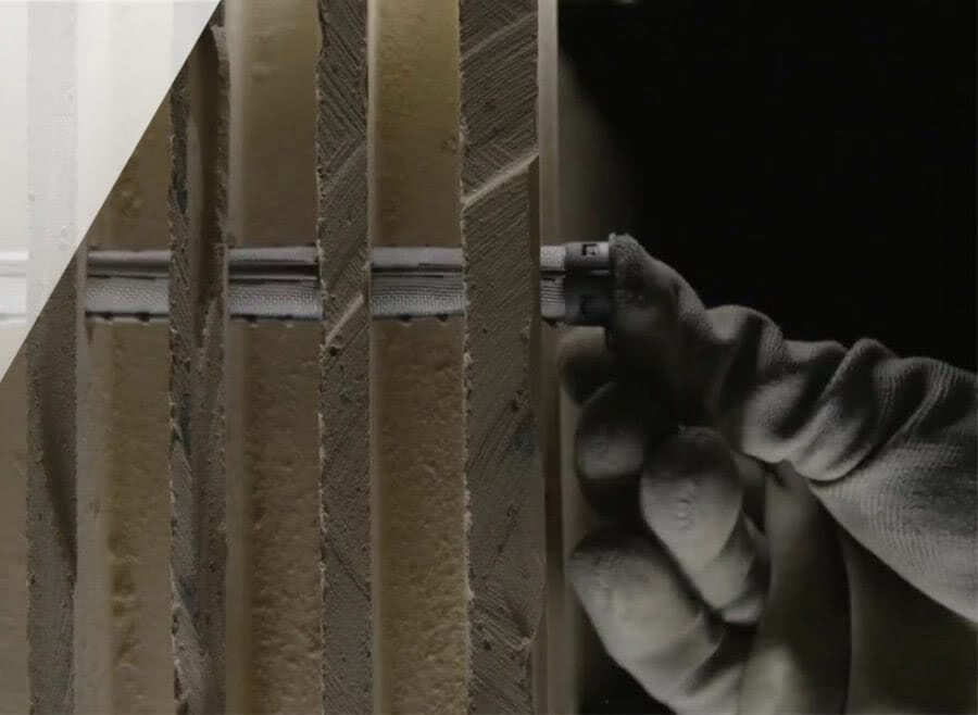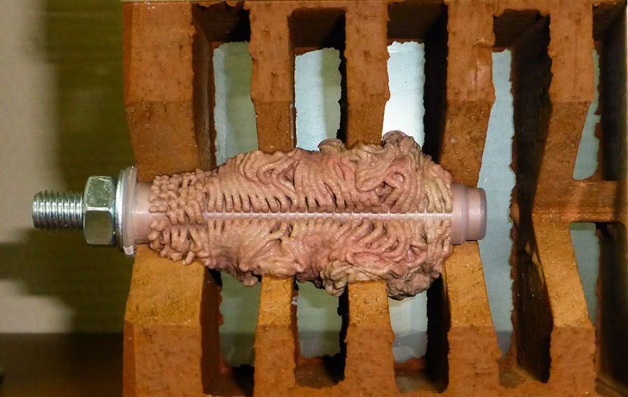 Процедура помещения химического дюбеля в пустотелый кирпич характеризуется рядом особенностей. Они связаны с тем, что наличие большого числа пустот не позволяет сформировать естественное отверстие. Для достижения цели вставляется специальная пластиковая гильза, которая заполняется клеем. При погружении шпильки в пустотелый кирпич часть химического состава выходит через сетчатые стенки гильзы в полости. Это способствует большему сцеплению.