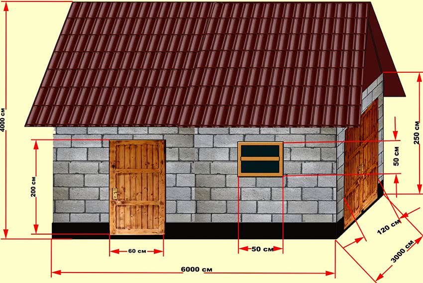 План небольшого дачного сарая из пеноблоков размером 6х4х3 м.