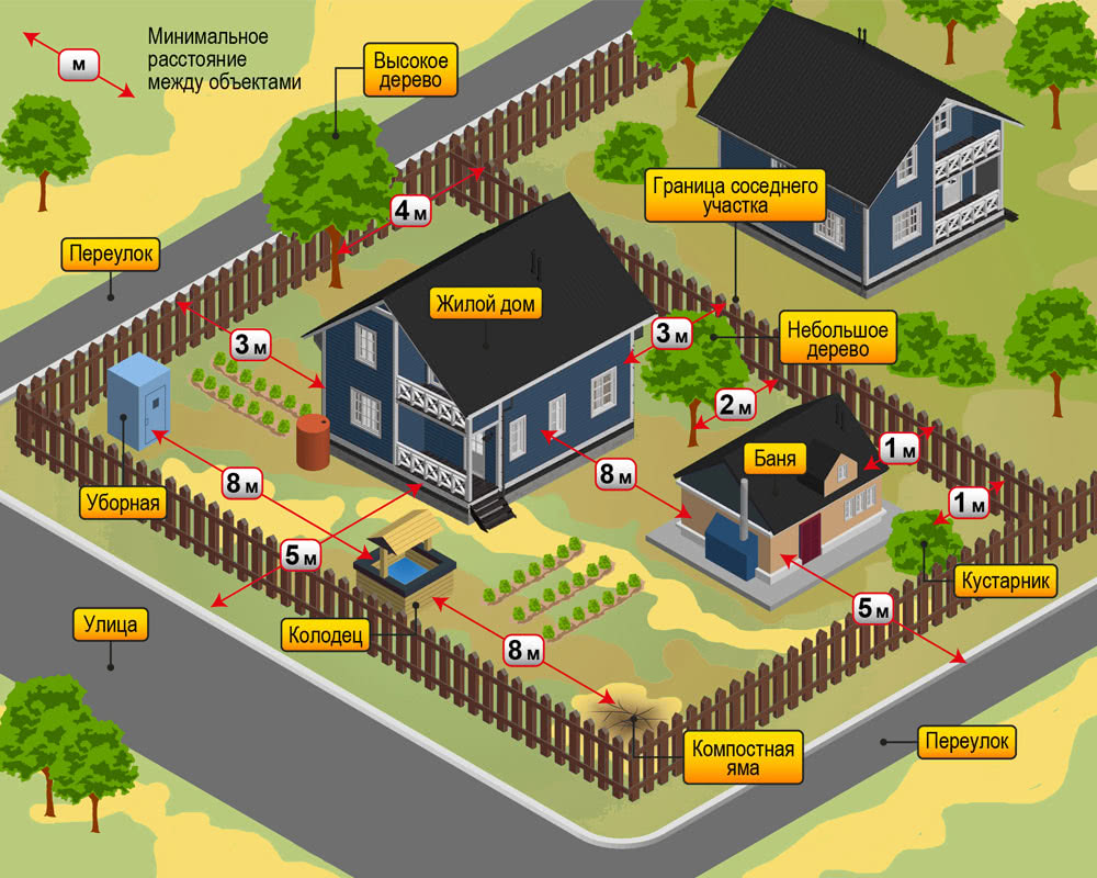 Расстояние объектов устанавливается для обеспечения противопожарной безопасности, а также равномерного доступа солнечных лучей. Например, если отсутствует магистральное газоснабжение, то баллоны с газом должны храниться в пристройке на глухой стороне стены или в специальном металлическом ящике.