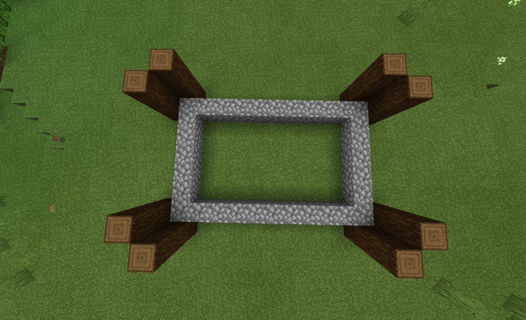 - После мы берем бревна. В нашем случае — это ель. Мы располагаем её по углам, так как показано на скриншоте и поднимаем на 5 блоков.
