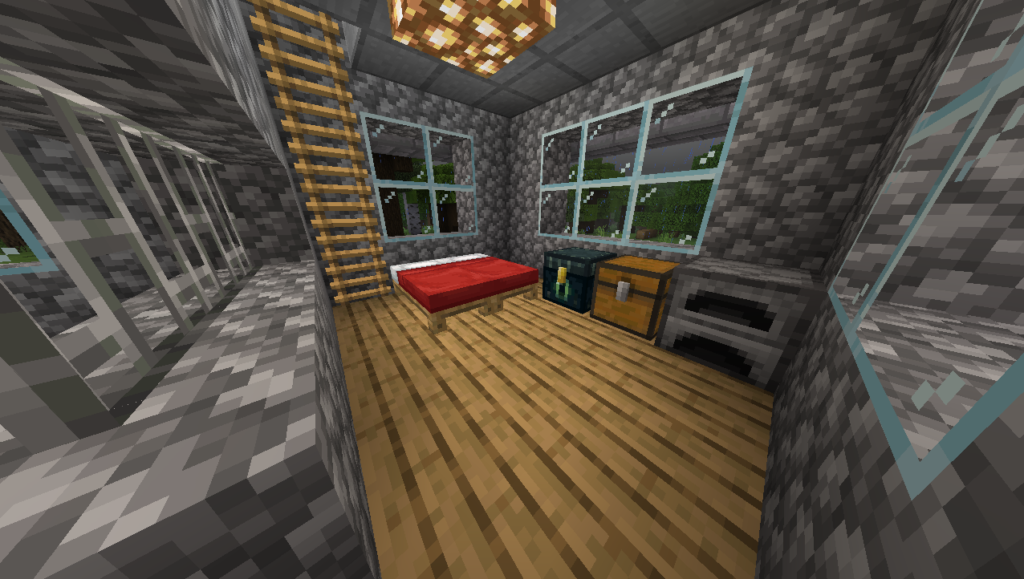 Удовлетворительно симметричный дизайн, этот приподнятый дом дает каждому игроку свое пространство , в комплекте с гостиной и спальней. Открытая дорожка предназначена для защиты от монстров и обеспечения свежего воздуха, а под ней спрятана аккуратная небольшая ферма. Игроки также могут использовать нижний слой, чтобы освободить больше внутреннего пространства, например, общего пространства.