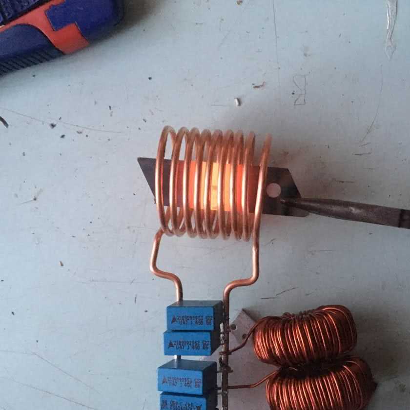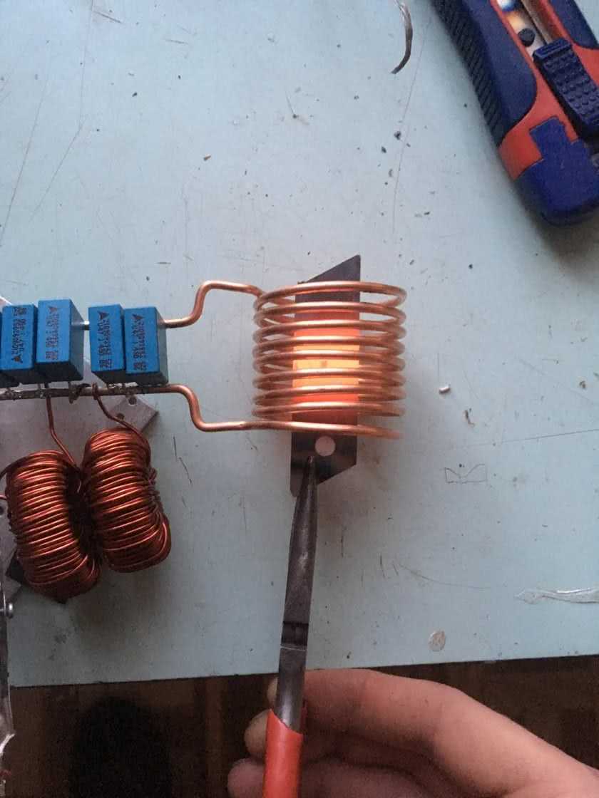 Причём она работала и от 5-ти вольт, и с маленькой штатной катушкой, и с большой самодельной, в общем генерировала мощное электромагнитное поле во всех позах (с теми же деталями и схемой). Раскаляет 3 мм штырь до красна за 20 секунд. С железкой 6 мм возится несколько минут, при этом жутко греется само (в основном транзисторы и катушка).