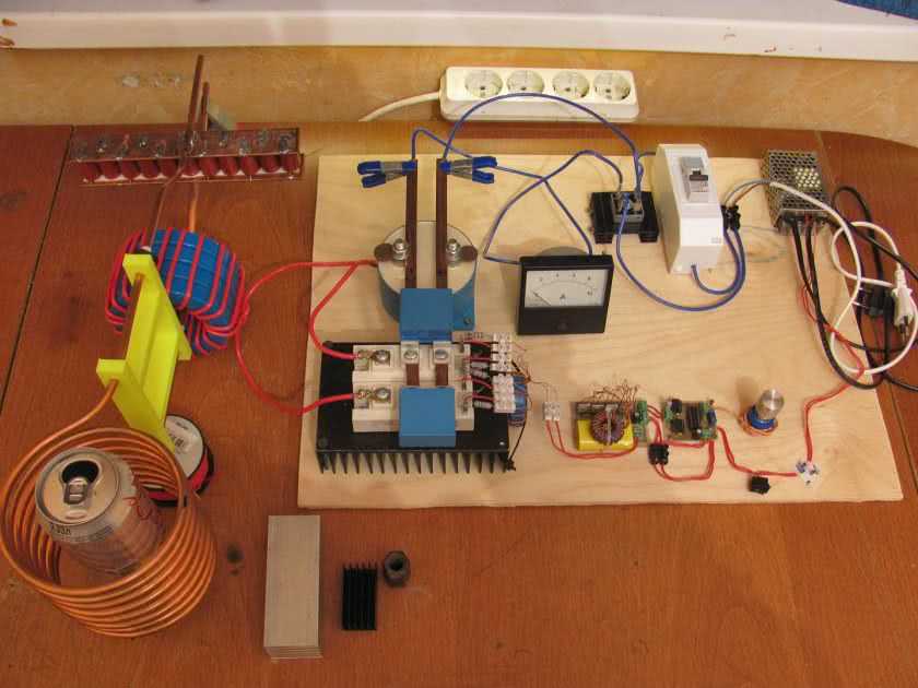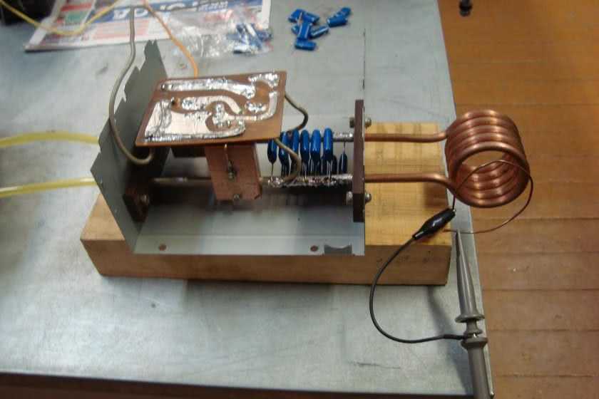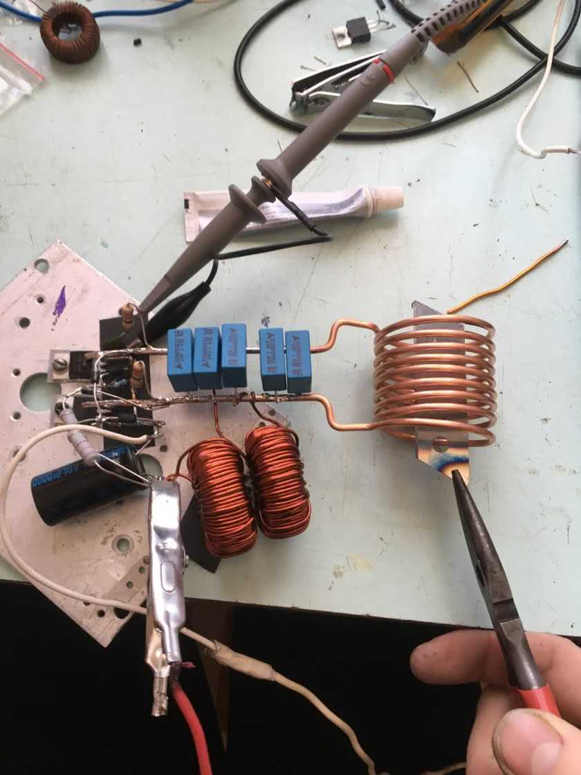 Добыча искомых и установка также оказалась безрезультативной — индукционный нагреватель металлов как не работал раньше, так и не собирался работать дальше. Подключение различных вариантов катушек совместно с конденсаторами разной емкости картину не изменили — «открывает рыба рот, но не слышно что поёт», то есть транзисторы открываются, ток тянут, а генерации не происходит…