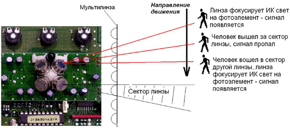 В центре устройства, на котором размещена схема обработки сигнала, находится пироэлектрический ИК датчик. Основная линза состоит из множества маленьких линз, каждая из которых фокусирует ИК свет на плоскость фотоэлемента, а одна из них непосредственно на сам фотоэлемент, и происходит регистрация сигнала. Во время движения человека фокус линзы смещается с фотоэлемента, сигнал пропадает. В то же время подключается другая линза, которая в свою очередь фокусирует ИК свет, и сигнал вновь появляется. Чем больше линз, тем выше чувствительность датчика. В приборе их может быть от 20 до 60.