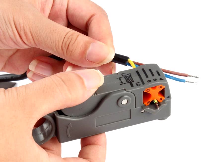 - На стриппере задается требуемая длина, после чего фазный и нулевой проводники помещаются в инструмент. Делается полная зачистка.