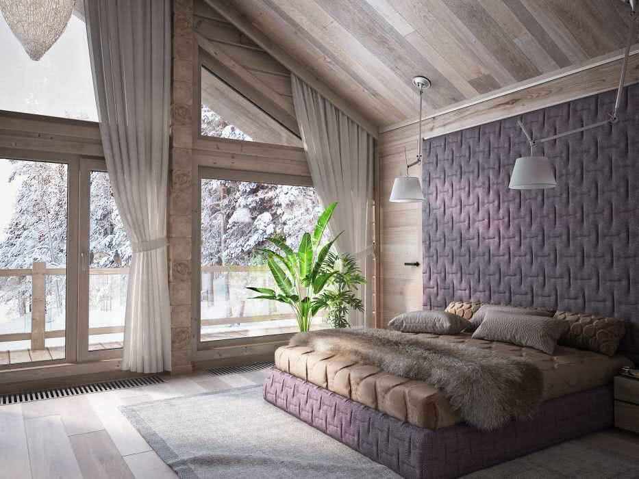 В спальне можно объединить очарование натурального дерева и современных элементов интерьера. Расположение окон в спальне на мансарде будет благоприятствовать утреннему пробуждению и обеспечивать оптимальное освещение спальни.