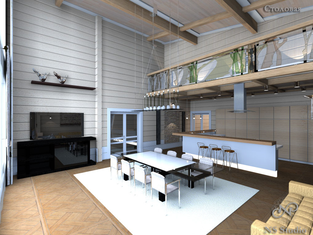 На фото дизайн кухни-гостиной в загородном доме из клееного бруса.