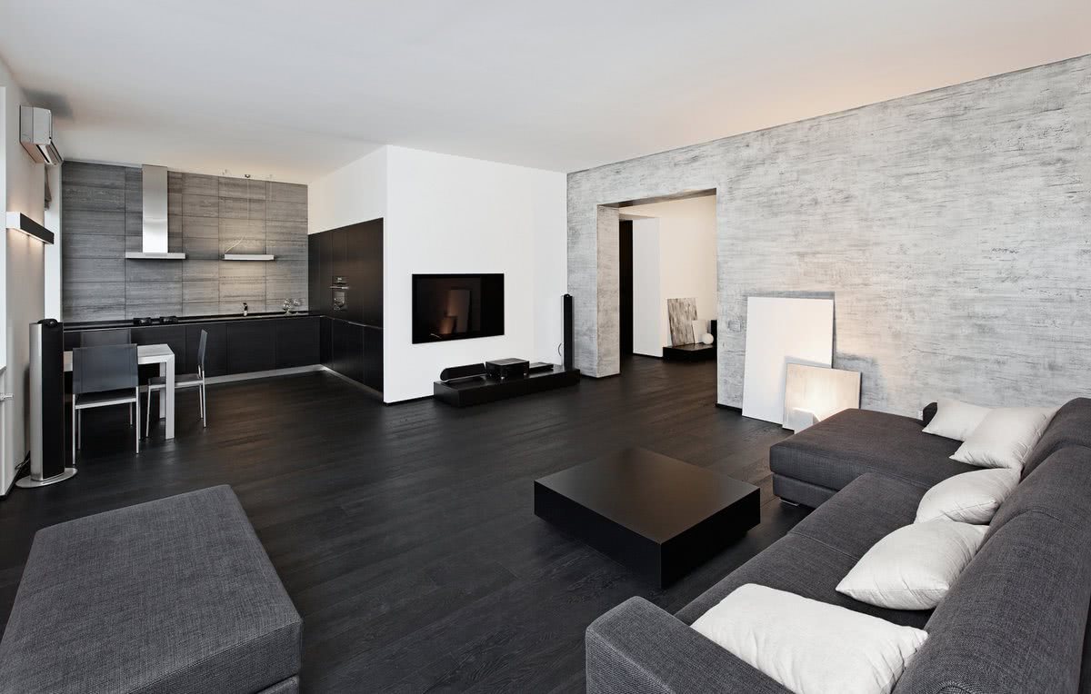 В качестве светлой основной палитры может использоваться и серый – натуральный цвет бетона, который может использоваться в интерьере гостиной в стиле минимализм в исходном виде (как на фото выше, где демонстрируется необработанная бетонная стена). Впрочем, в качестве покрытия выбирают и штукатурку – фактурную, но однотонную.