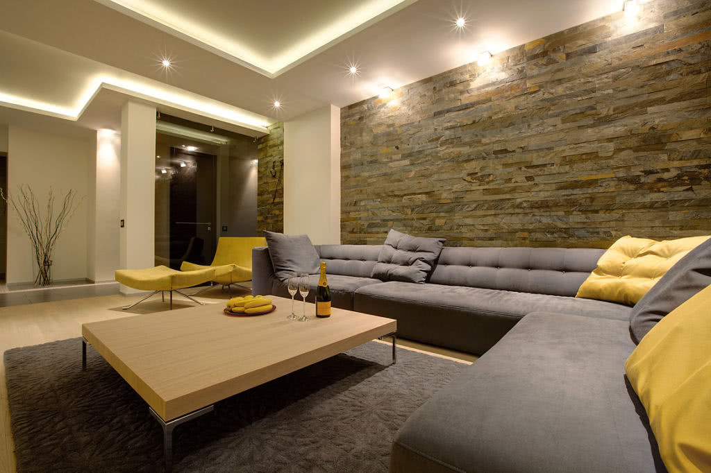 Для минималистичной обстановки гостиной больше всего подходит рассеянное освещение