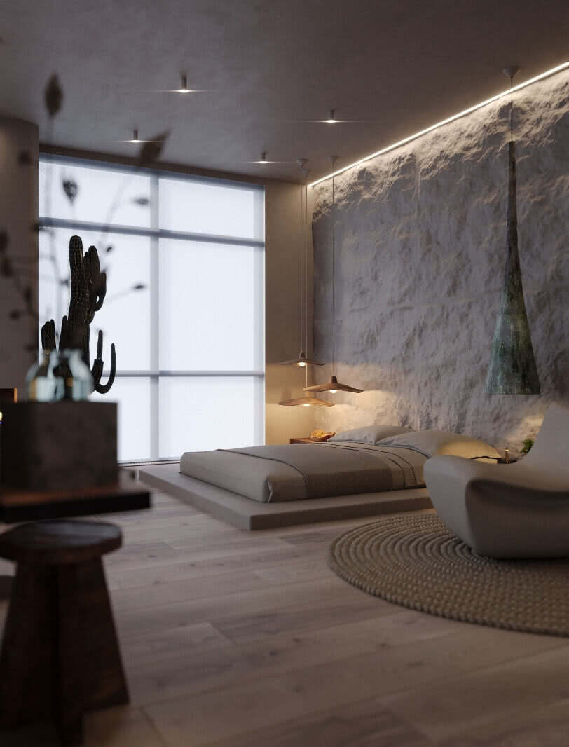 Безусловно, главным предметом спальни является кровать, которую очень часто оформляют в виде кровати-футона или подиума, также нередко устанавливают японские кровати со скрытыми ножками. В любом случае, изголовье кровати должно быть едва выраженным либо полностью отсутствовать.