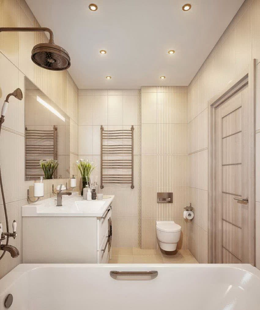 Варианты дизайна маленькой ванной комнаты с грамотно расставленной мебелью и сантехникой представлены на подборке фото далее.